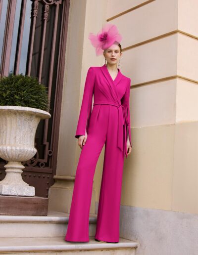 Evening jumpsuit made of crepe. Featuring a V-neckline, open long sleeves, and a closed back.