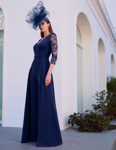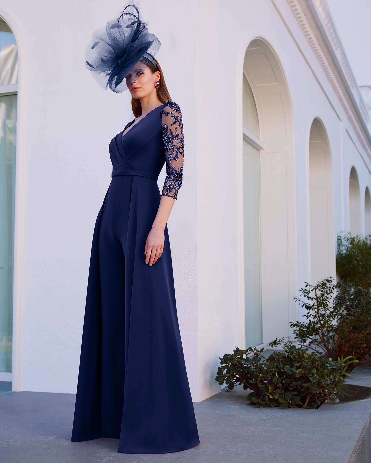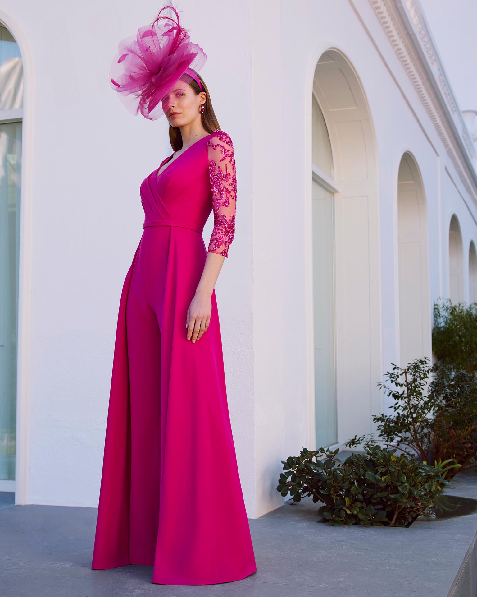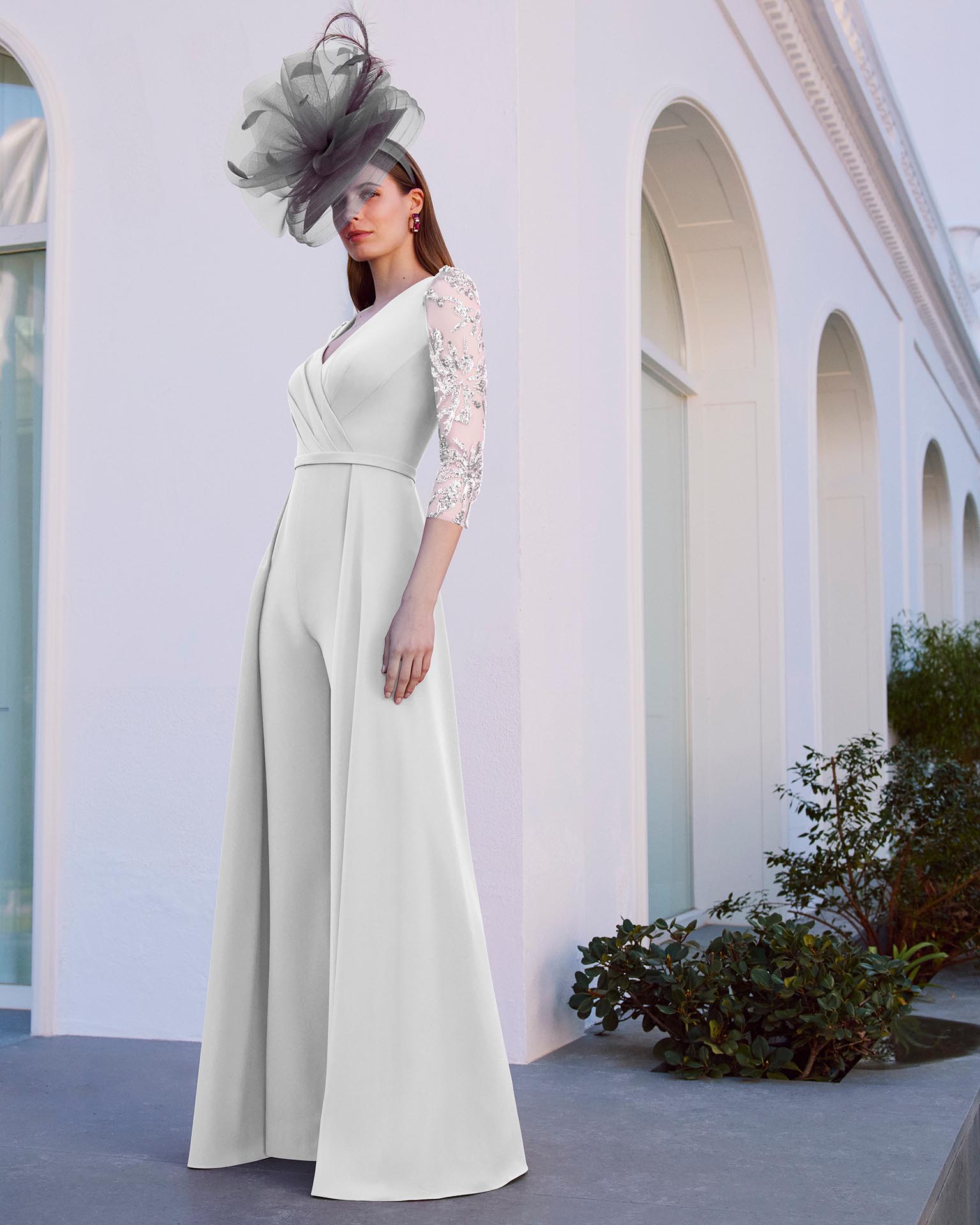 Evening jumpsuit made of crepe. Featuring a V-neckline, three-quarter sleeves, and a closed back.