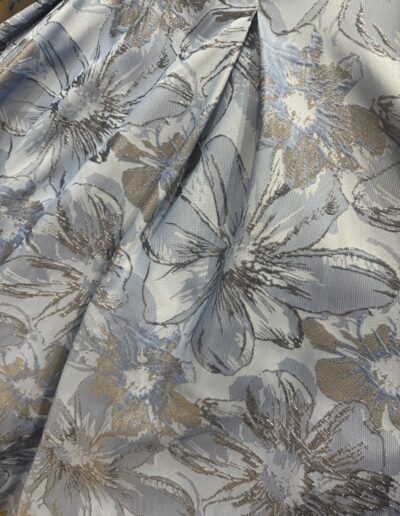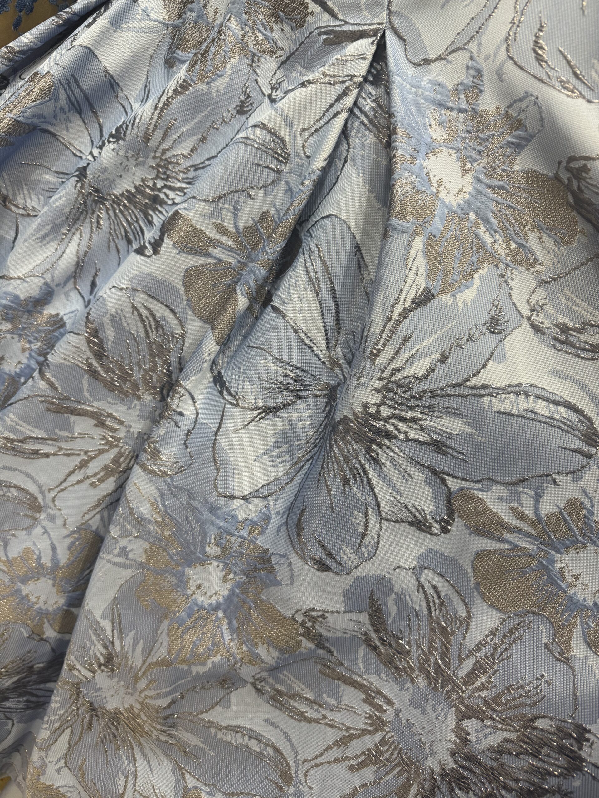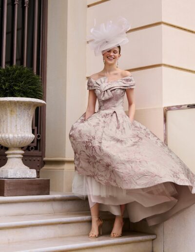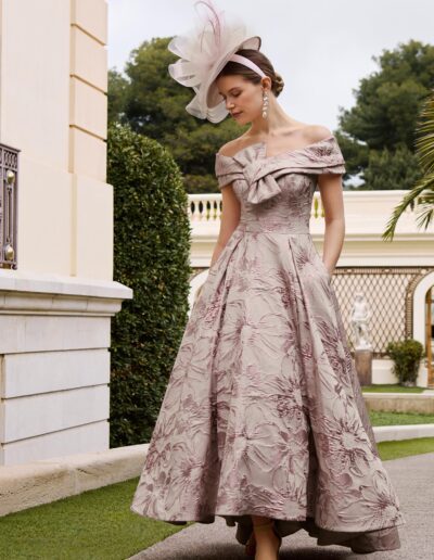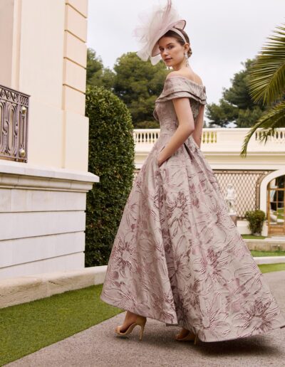 Long evening dress made of brocade. Featuring an off-the-shoulder neckline, dipped hem, pockets and a matching shawl.