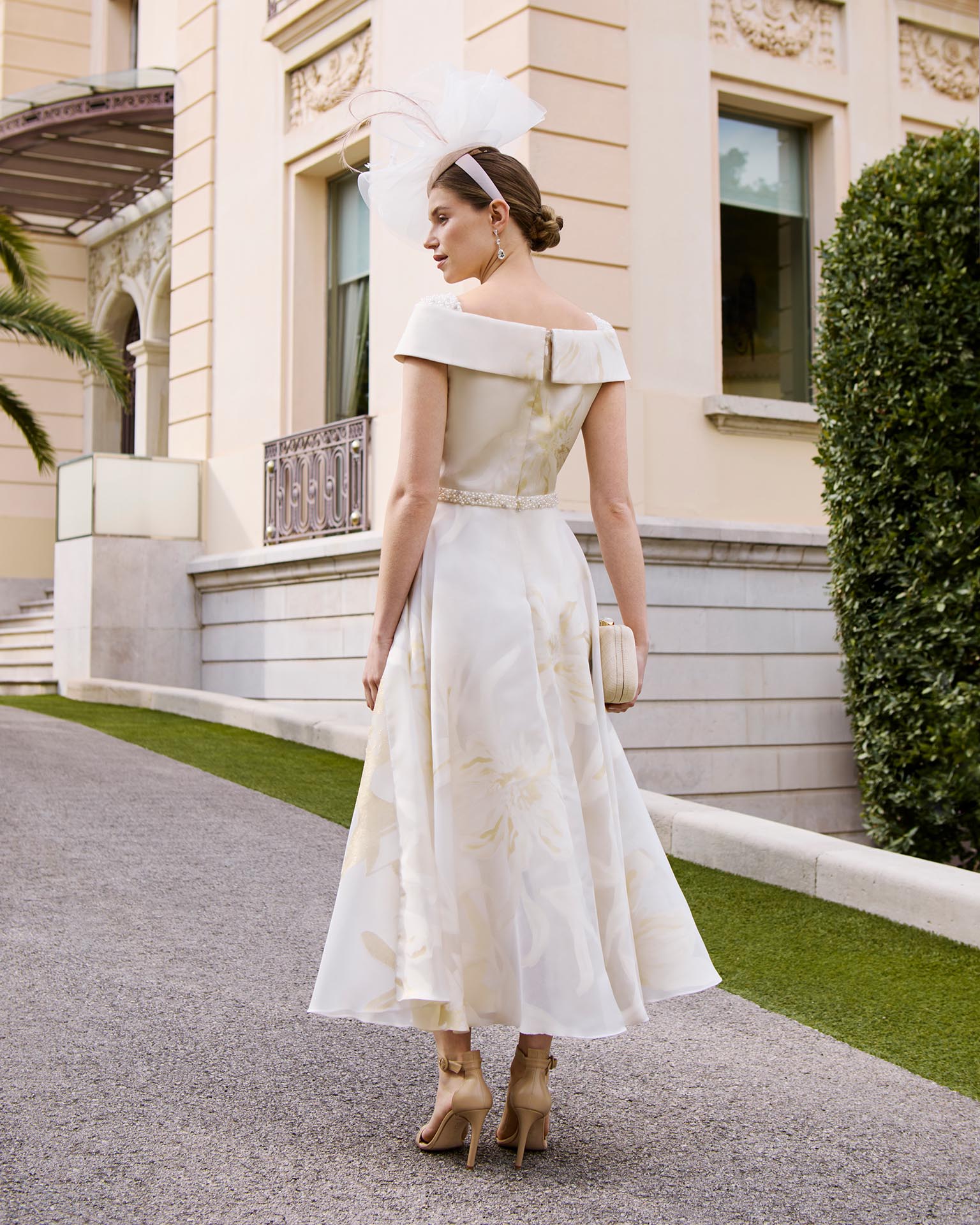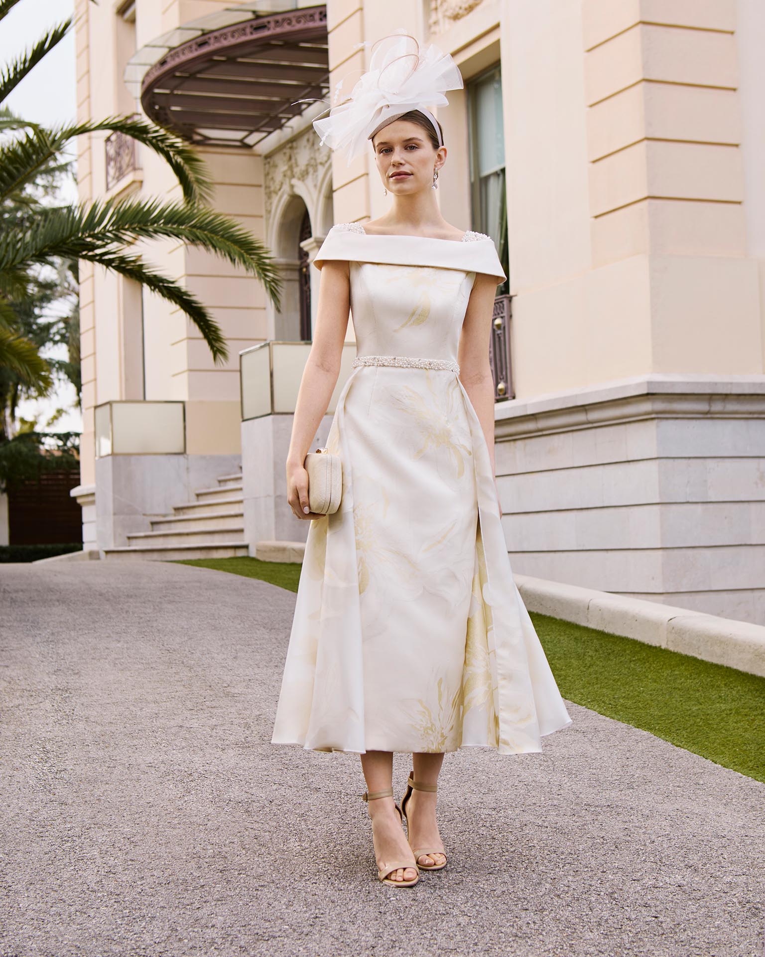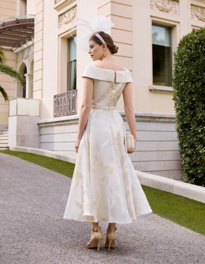 Midi evening dress, made of fil coupé with beading. Featuring a wrap neckline and a back zipper.