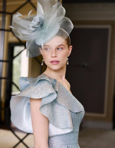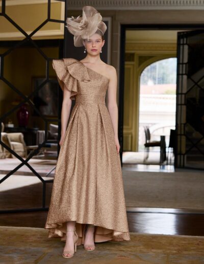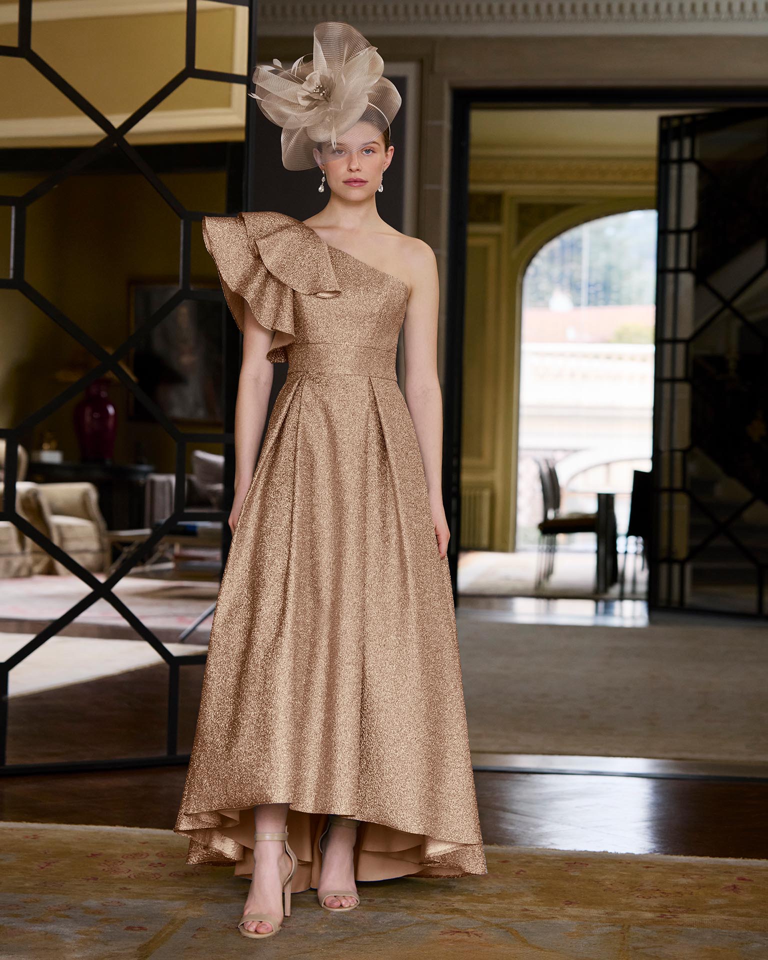 High-low evening dress, made of brocade. Featuring an asymmetrical neckline and a shawl.