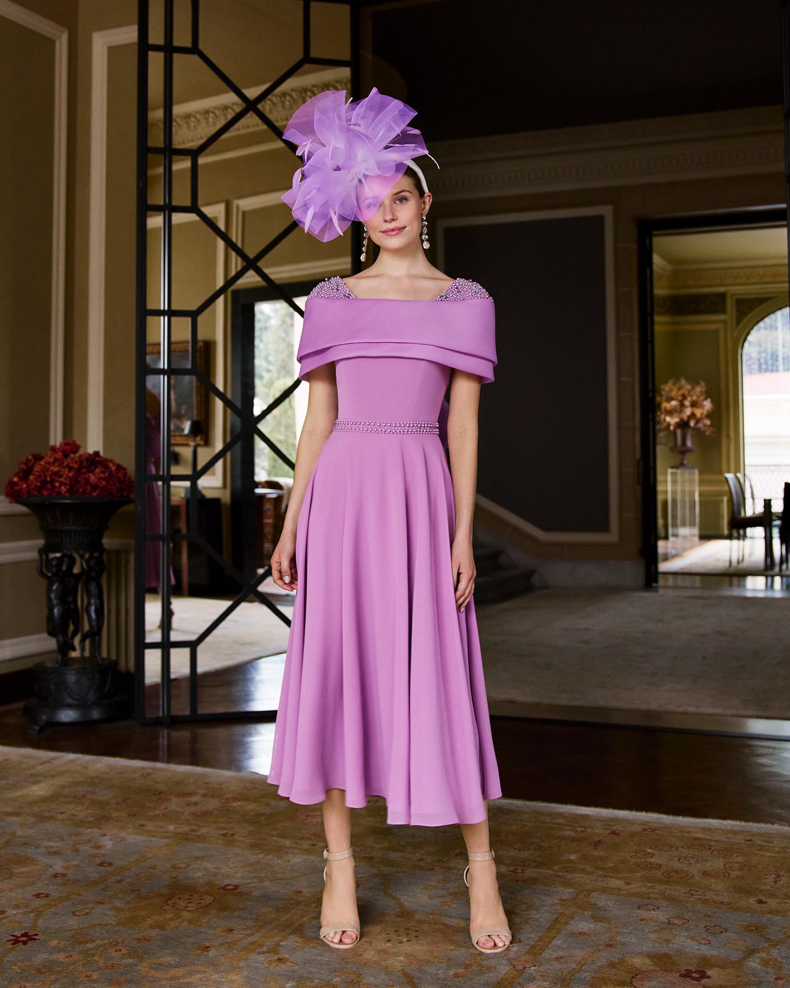 Midi evening dress, made of georgette with beading. Featuring a wrap neckline, draped sleeves, a back with a bow detail, and a shawl.