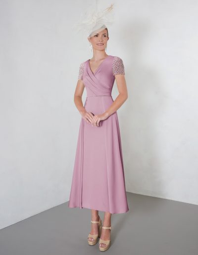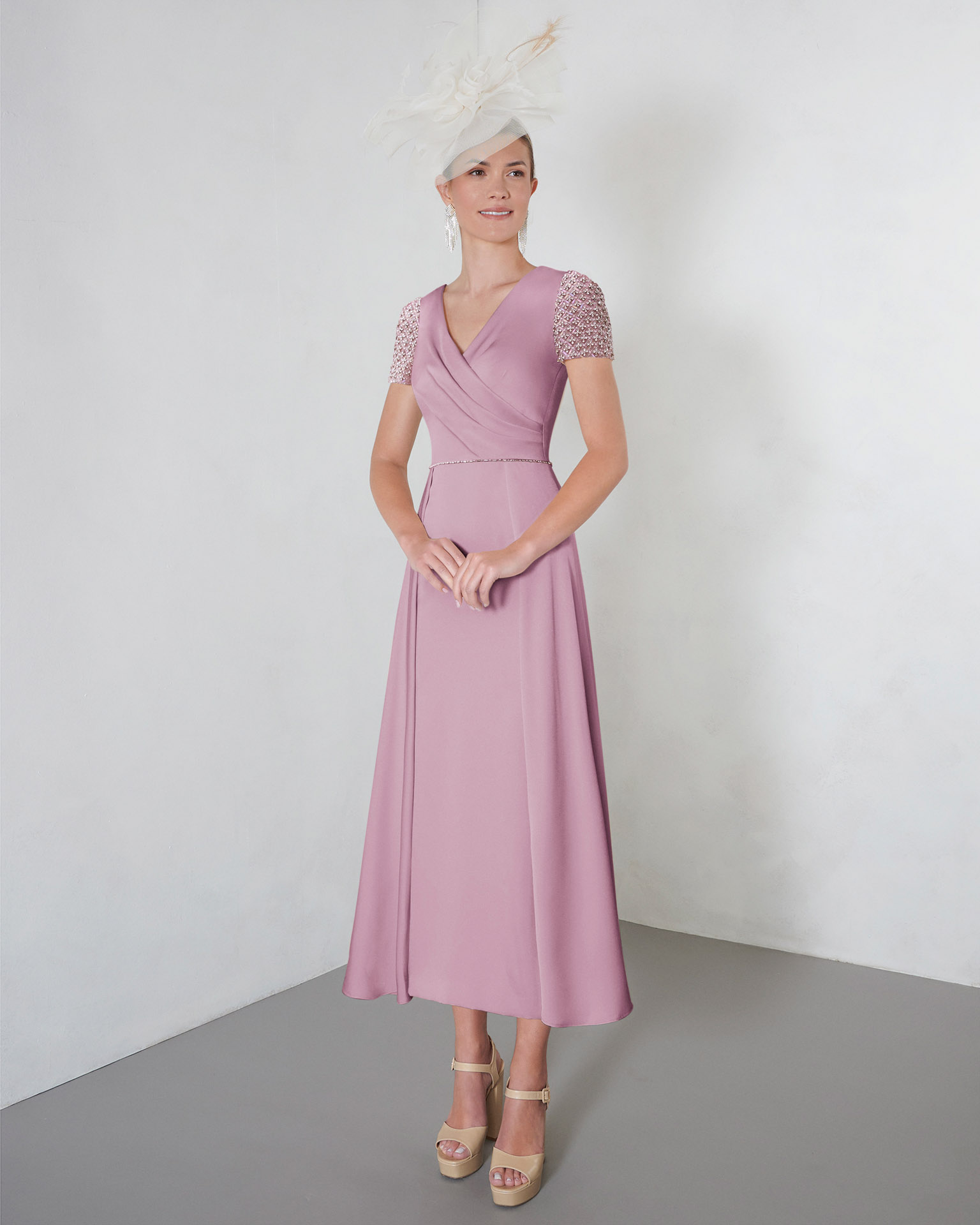 Dress in satin crepe with overskirt. Featuring v-neckline and beaded short sleeves. A Couture Club outfit.