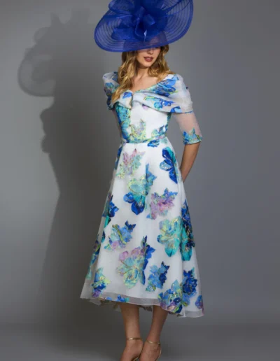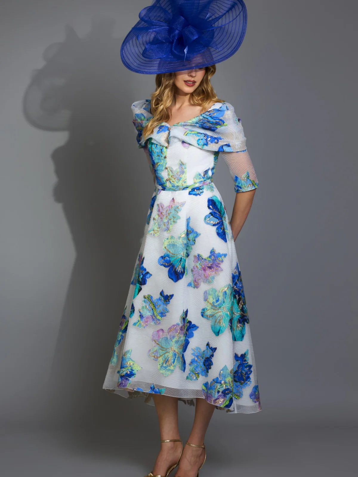 Gabriela Sanchez A-line gown with bardot neckline, pockets and 3/4 sleeves. Very lightweight so perfect for summer/abroad weddings.